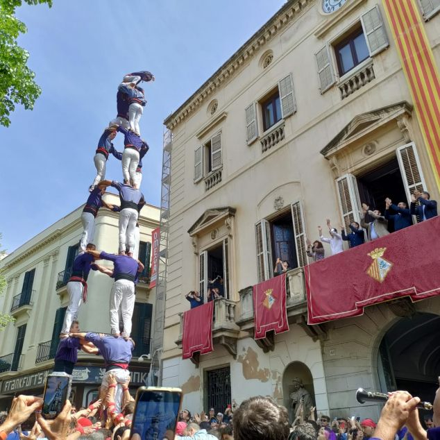Pilar de 5 al balcó i quatre pilars de 4 amb senyera, amb aquella cosa tant ‘santjordiera’ que té aquesta diada han tancat la seqüència pels de blau que no han estat sols i han convidat a Mataró una de les millors colles de castells de 7, els Castellers de Mollet, que han mostrat molt bones maneres fent la ‘clàssica de 7’ i el 5 de 6. Una molt bona diada per un 23 d’abril curull de gent arreu.